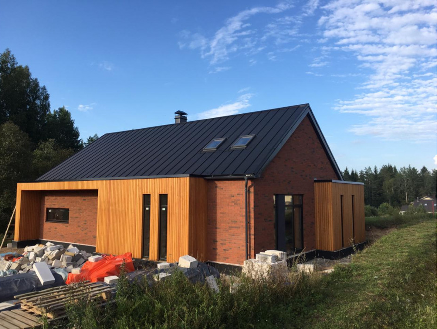 Проект выполнен на фундаменте, устроенном другой организацией. Дом из газобетона с железобетонным перекрытием, колоннами 300×300 мм и кровлей из металлочерепицы PurPro Matt RAL 7024.