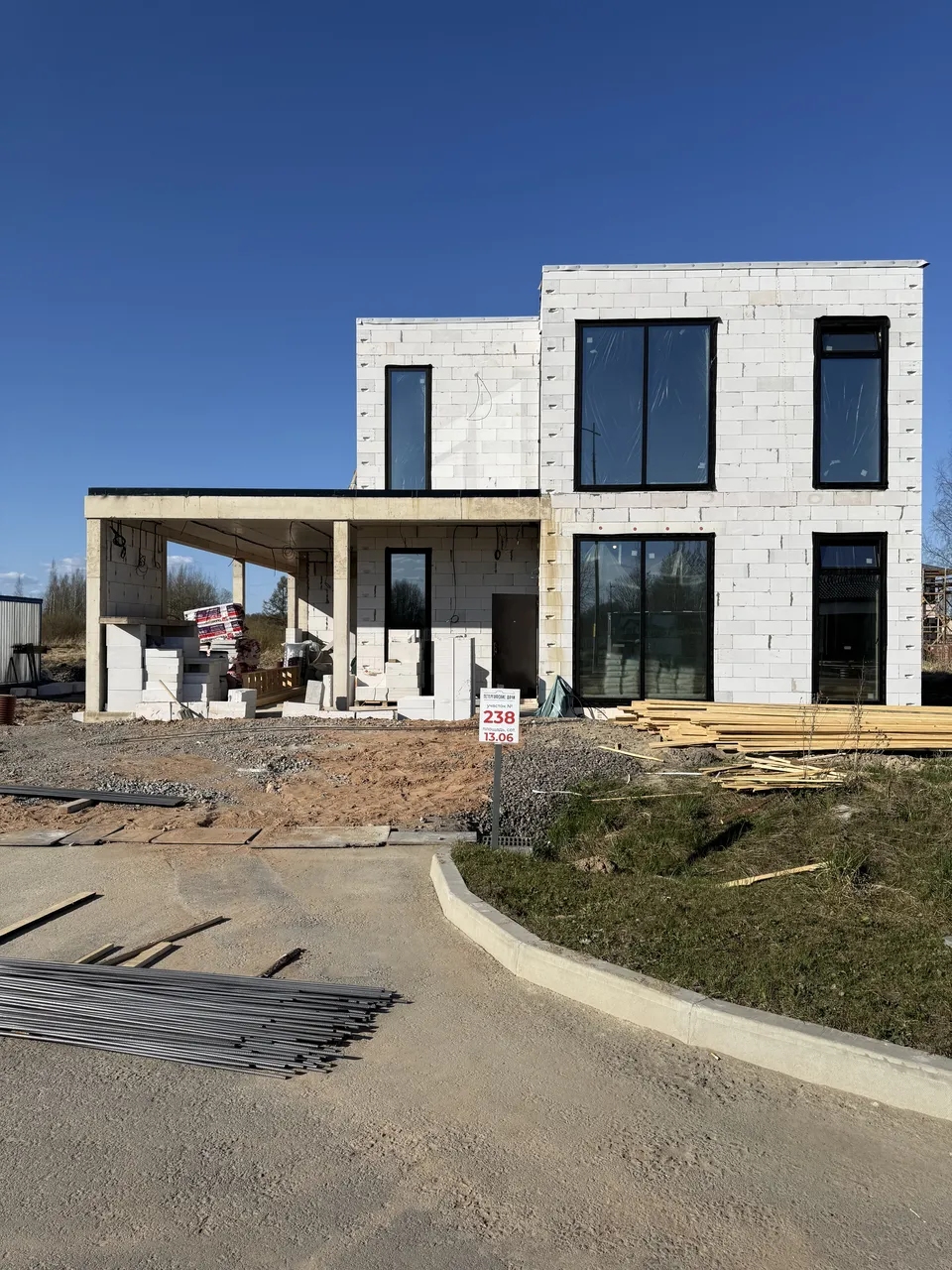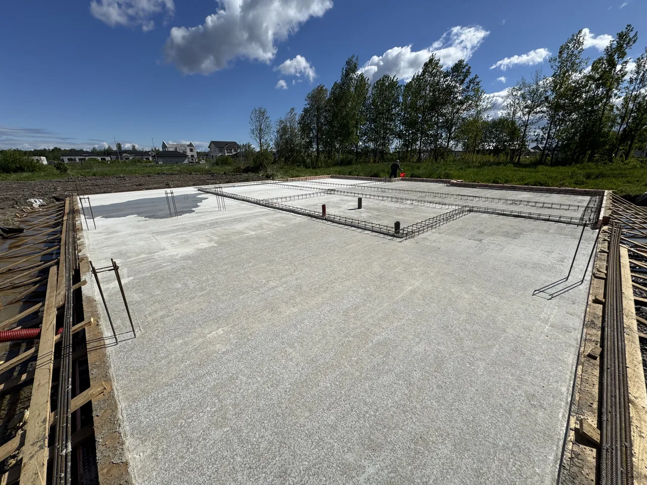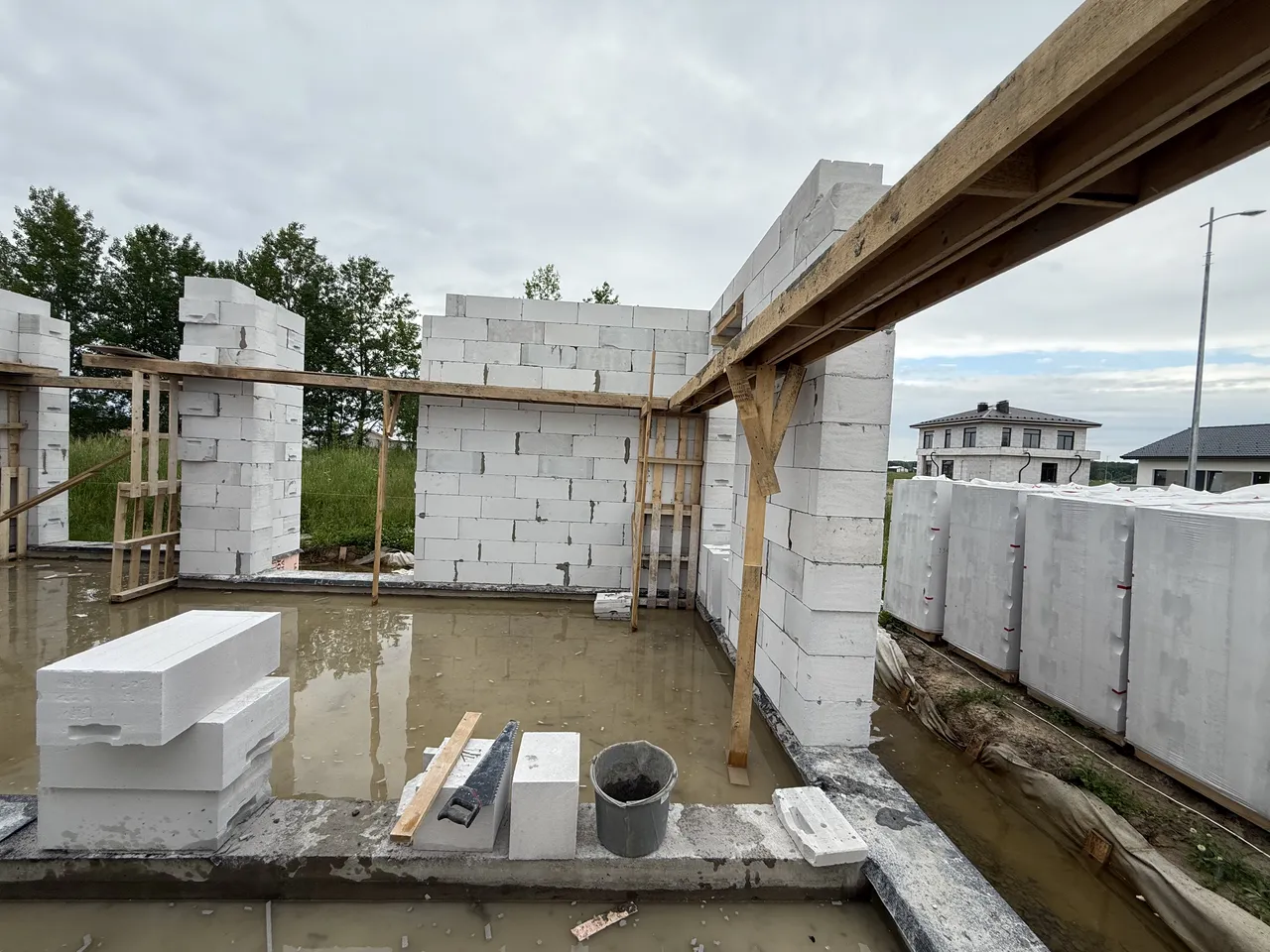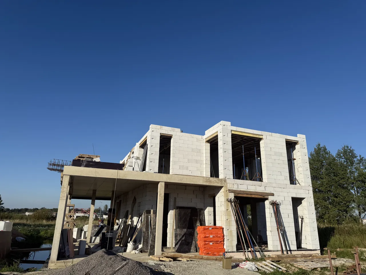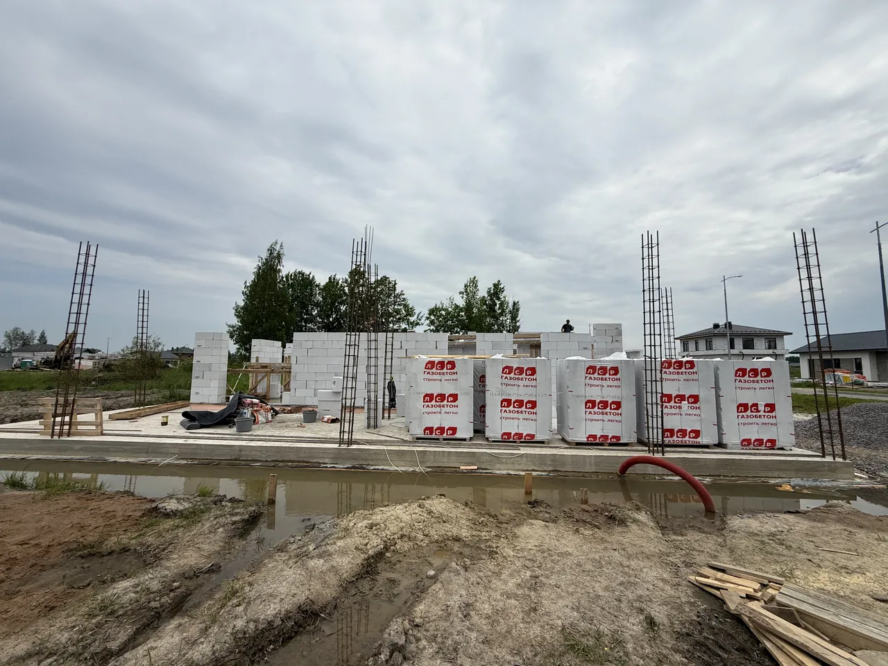 На объекте выполнены работы по осушению участка, устройству железобетонного фундамента и цокольного этажа, а также возведению стен из поризованного кирпича. Работы на объекте ведутся с октября 2024 года по настоящее время.