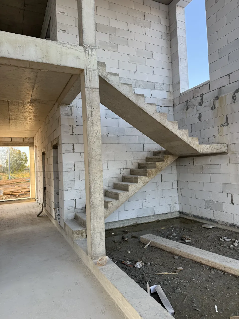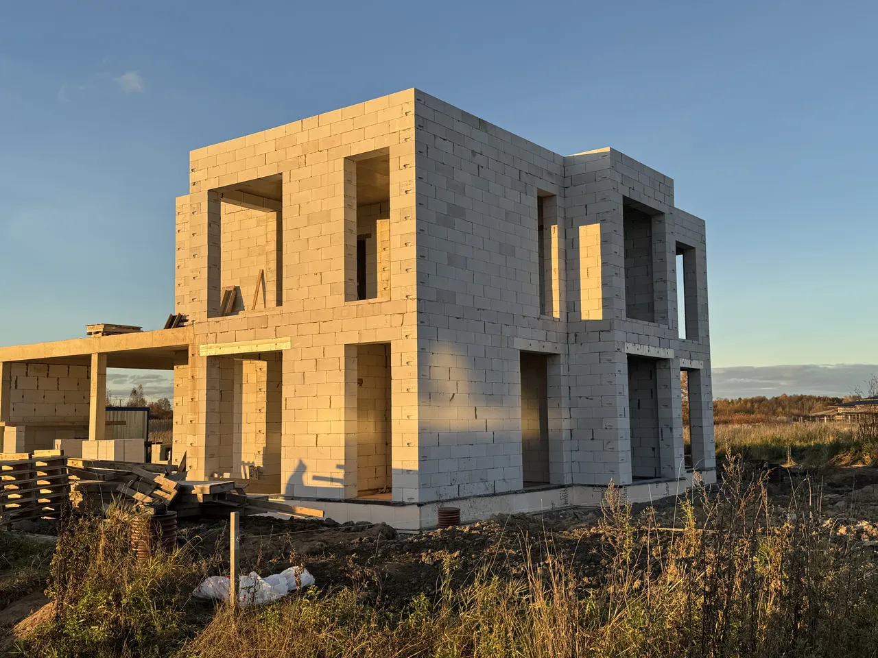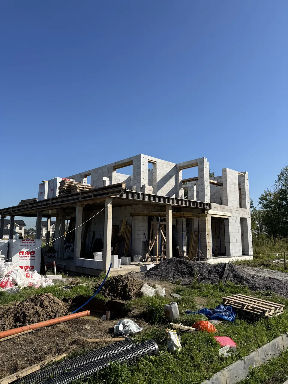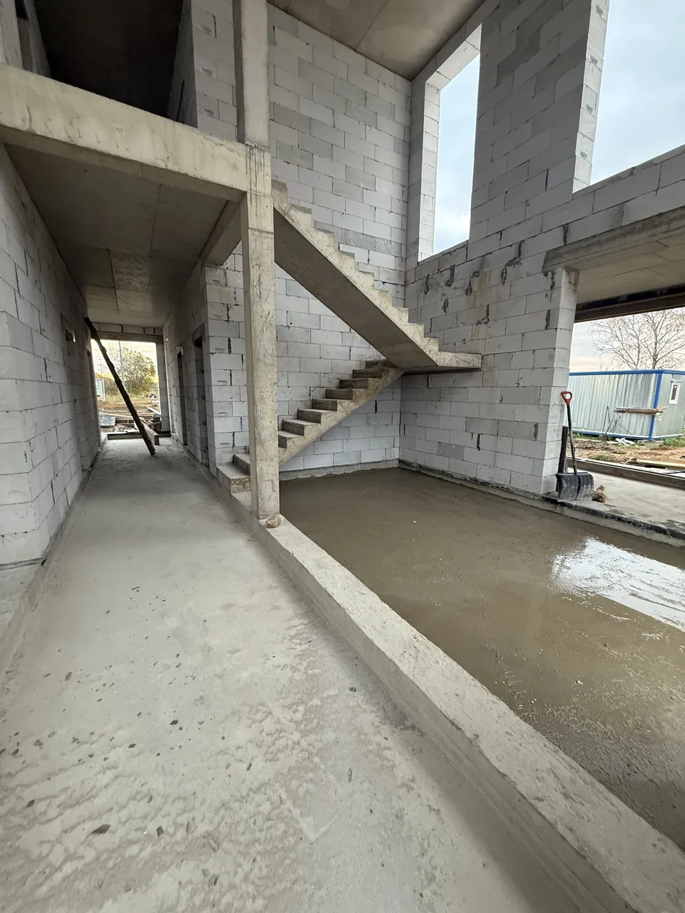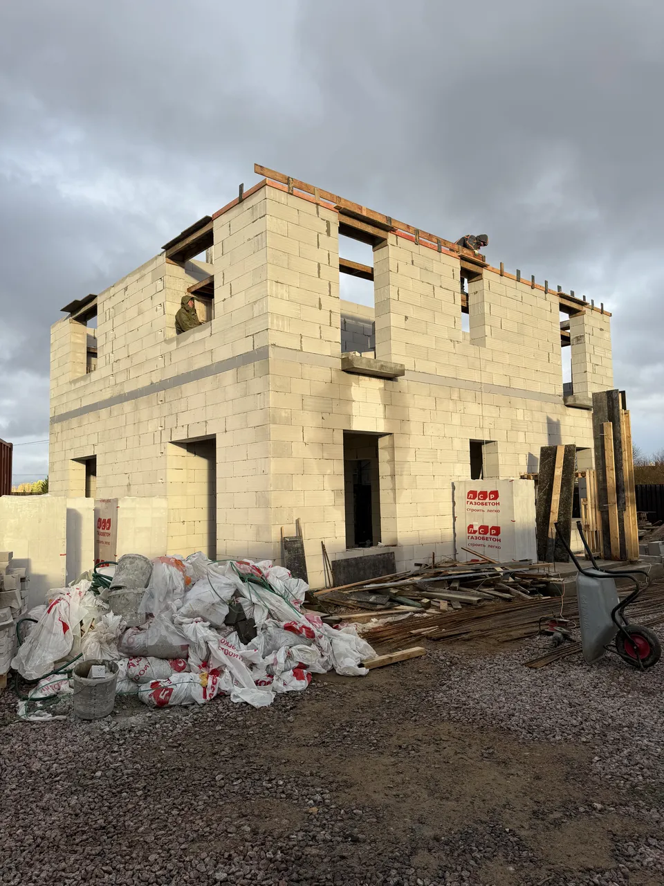 Дом из газобетона на железобетонной плите с ростверком и утеплением цоколя. Выполнены железобетонная лестница, колонны 250×250 мм и плита перекрытия под плоскую кровлю.