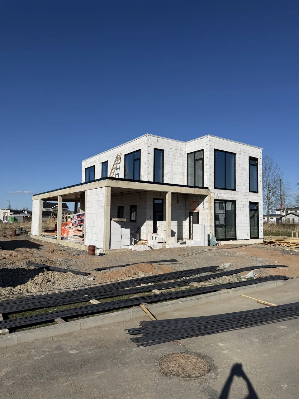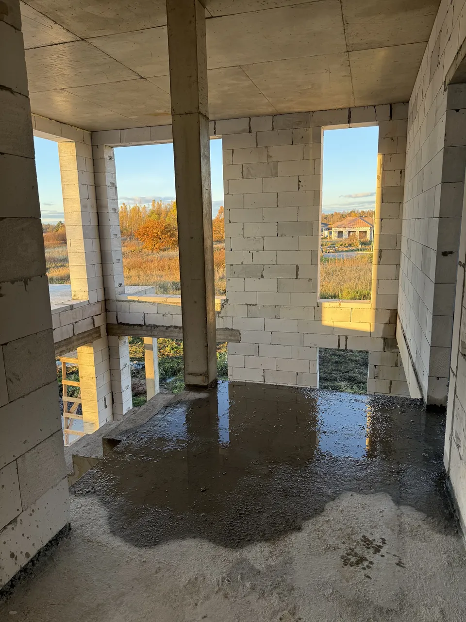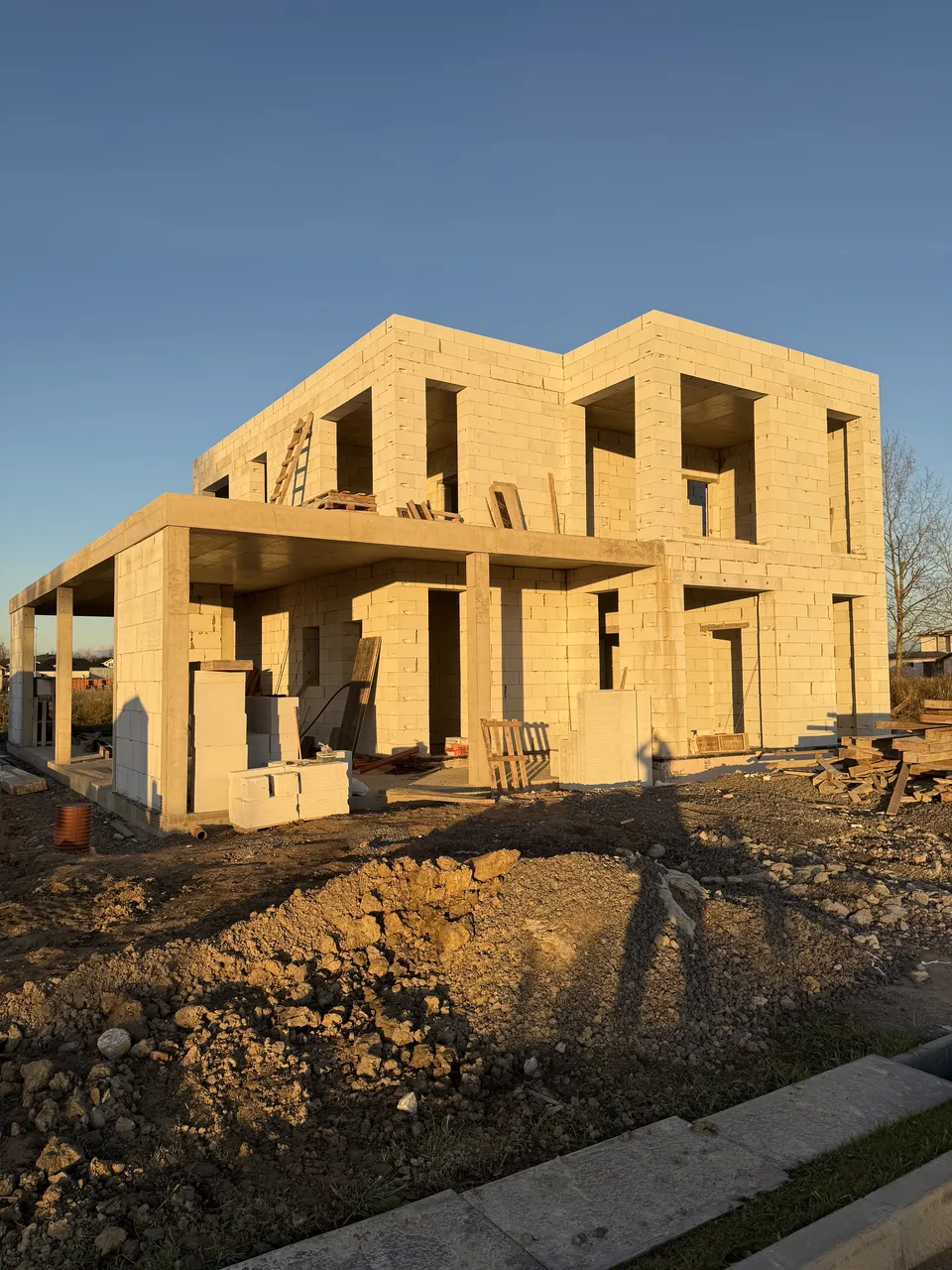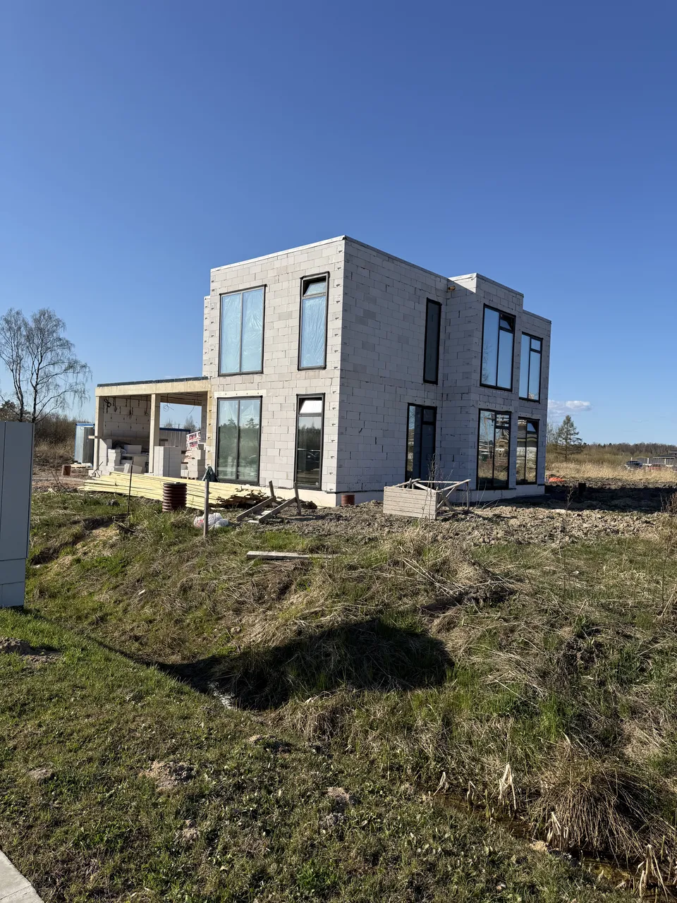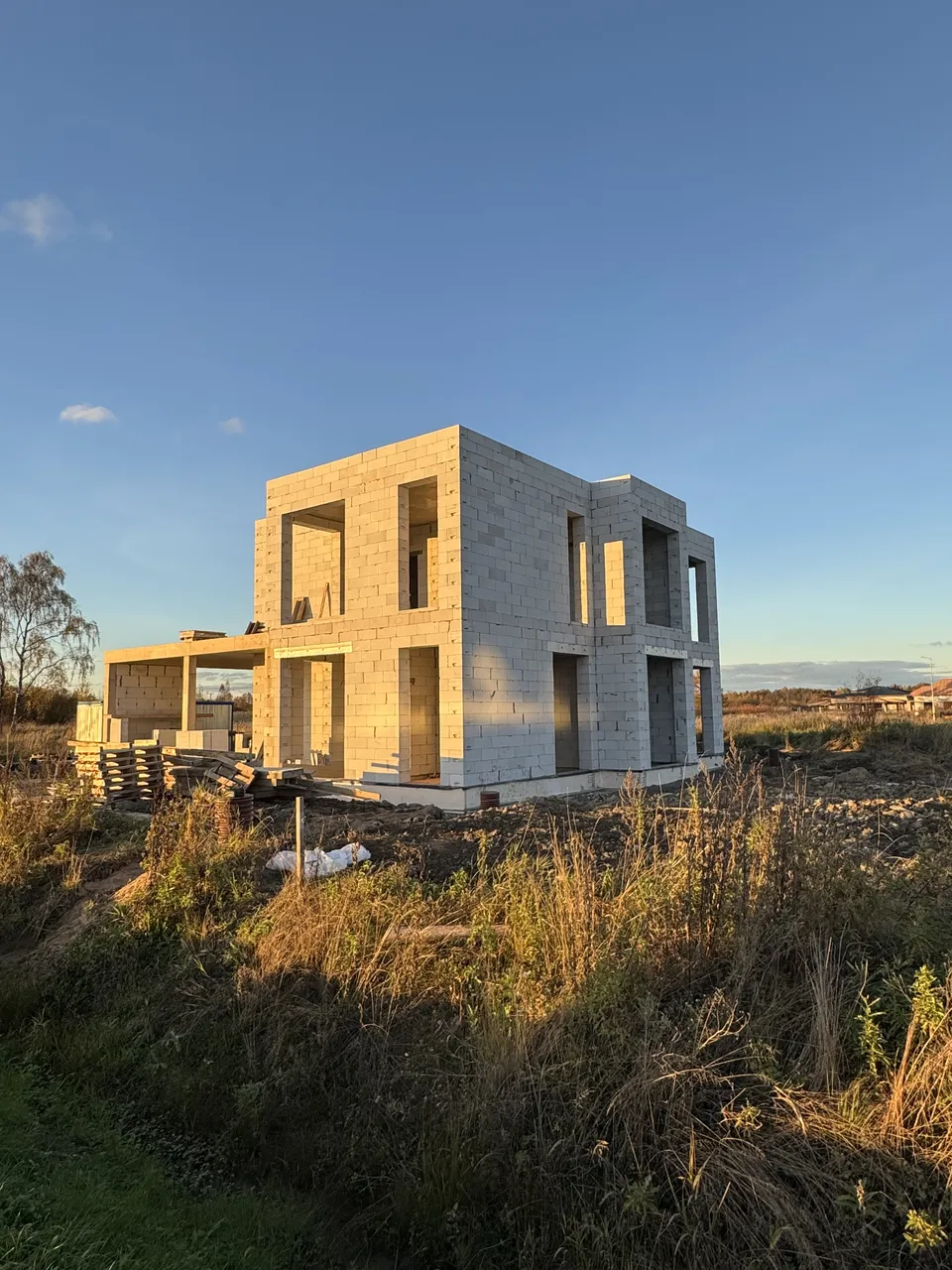 Дом из газобетона на железобетонной плите с ростверком и утеплением цоколя. Выполнены железобетонная лестница, колонны 250×250 мм и плита перекрытия под плоскую кровлю.