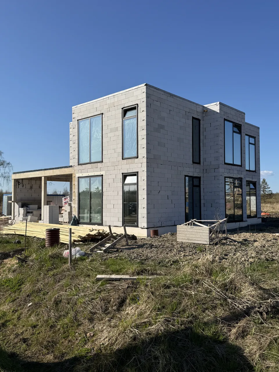 Проект выполнен на фундаменте, устроенном другой организацией. Дом из газобетона с железобетонным перекрытием, колоннами 300×300 мм и кровлей из металлочерепицы PurPro Matt RAL 7024.